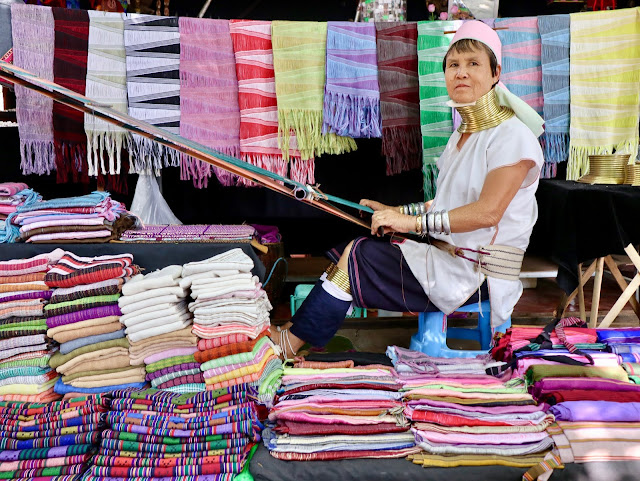 Mulher-girafa tecendo um longyi.